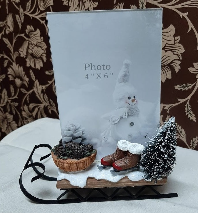 Display your 4x6 photo in this festive Alpine theme picture frame. Set atop of the vintage sled is the photo, a pair of skates, an evergreen tree and a wicker basket holding pine cones. A great addition to your Christmas display. 7.5" tall.