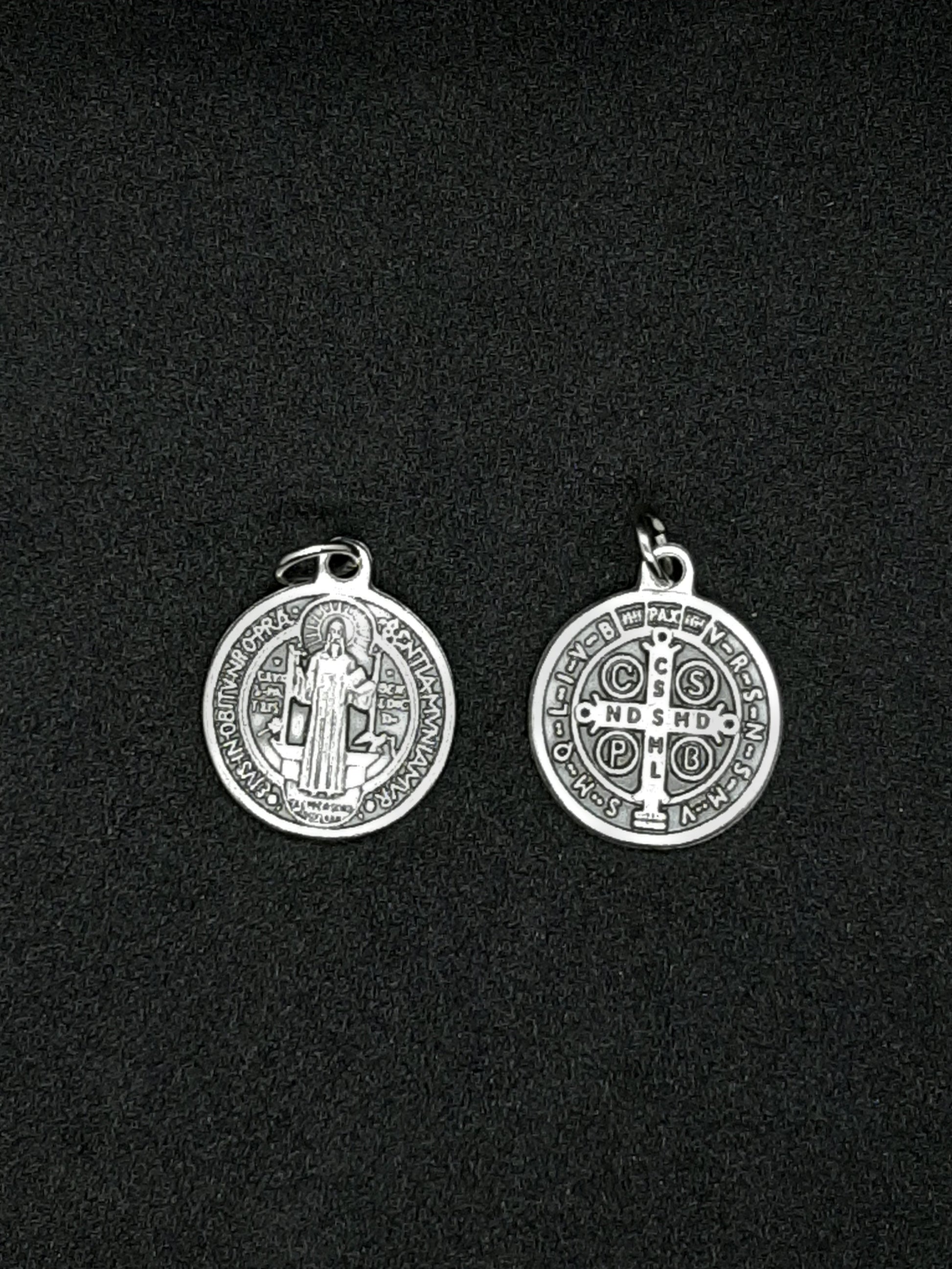 This circular Medal has the image of Saint Benedict on one side, and the Saint Benedict Cross on the other. Saint Benedict protects against evil, he is the Patron Saint of Europe and a happy death. Explanation of the letters on the Benedict cross, and their meaning are below. The medal is 3/4". Made in Italy. Does not come on a chain.