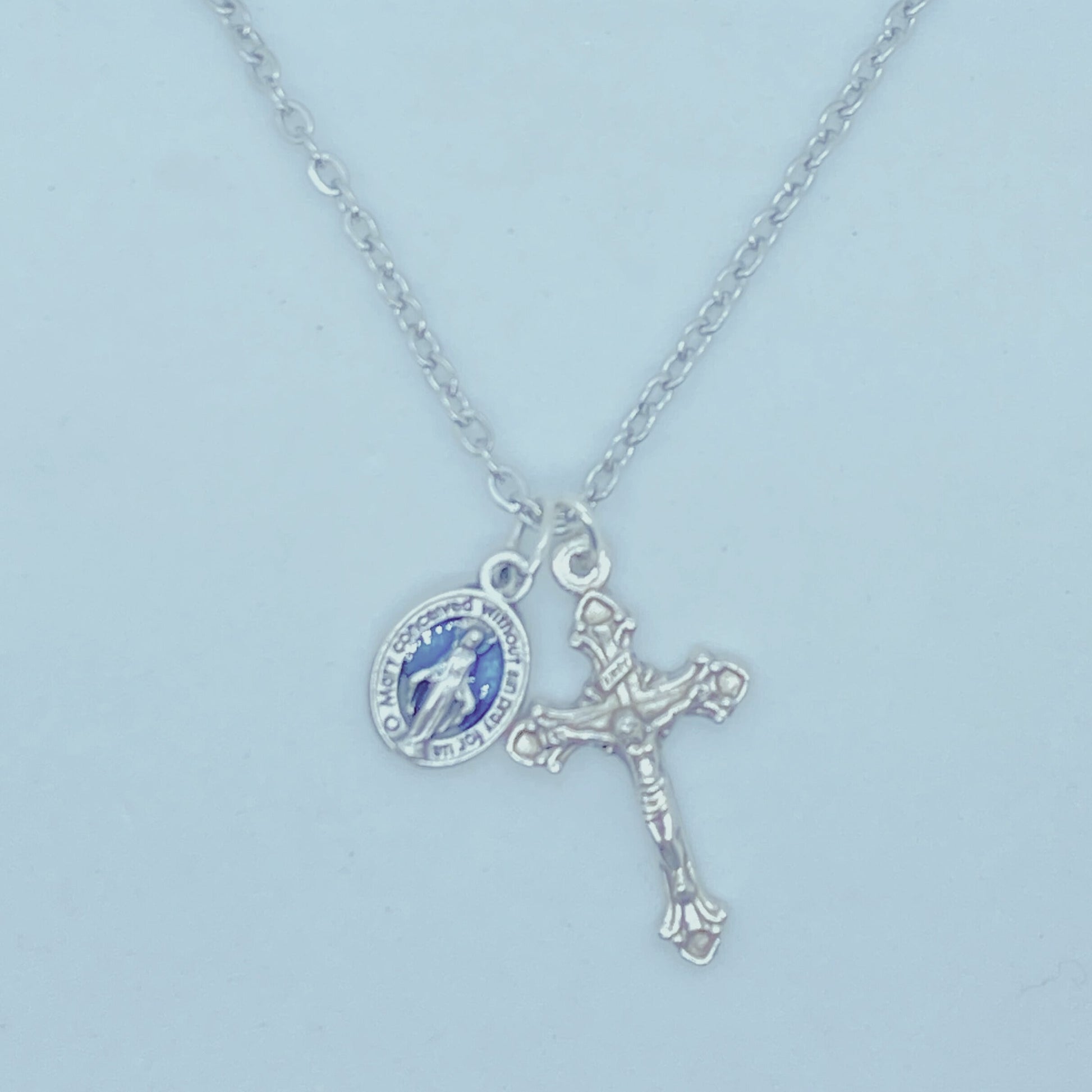 This unique piece of jewelry would be a great gift idea for Confirmation or graduation, for an adult who is completing the RCIA program, or for any celebration or Sacrament. The detail on the tiny 3/4" Crucifix is impressive. It is joined with a tiny 1/2" blue enamel-filled Miraculous medal of Our Lady. There is so much meaning in this piece. This item comes on an 18" chain.