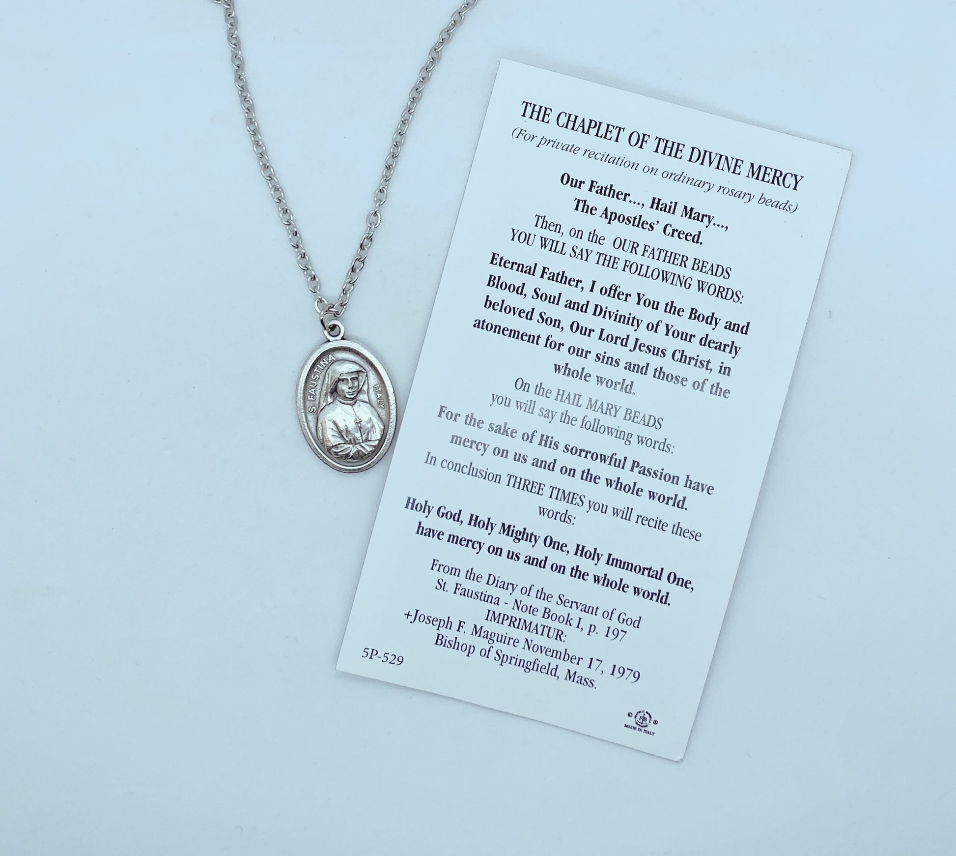 This set consists of a 3/4" oval medal of the Divine Mercy on a 24" chain with an image of the Saint on one side, and an image of Saint Faustina on the reverse. The prayer card has an image of the Divine Mercy on one side, and the Chaplet of the Divine Mercy on the reverse. This set comes in a vinyl case.