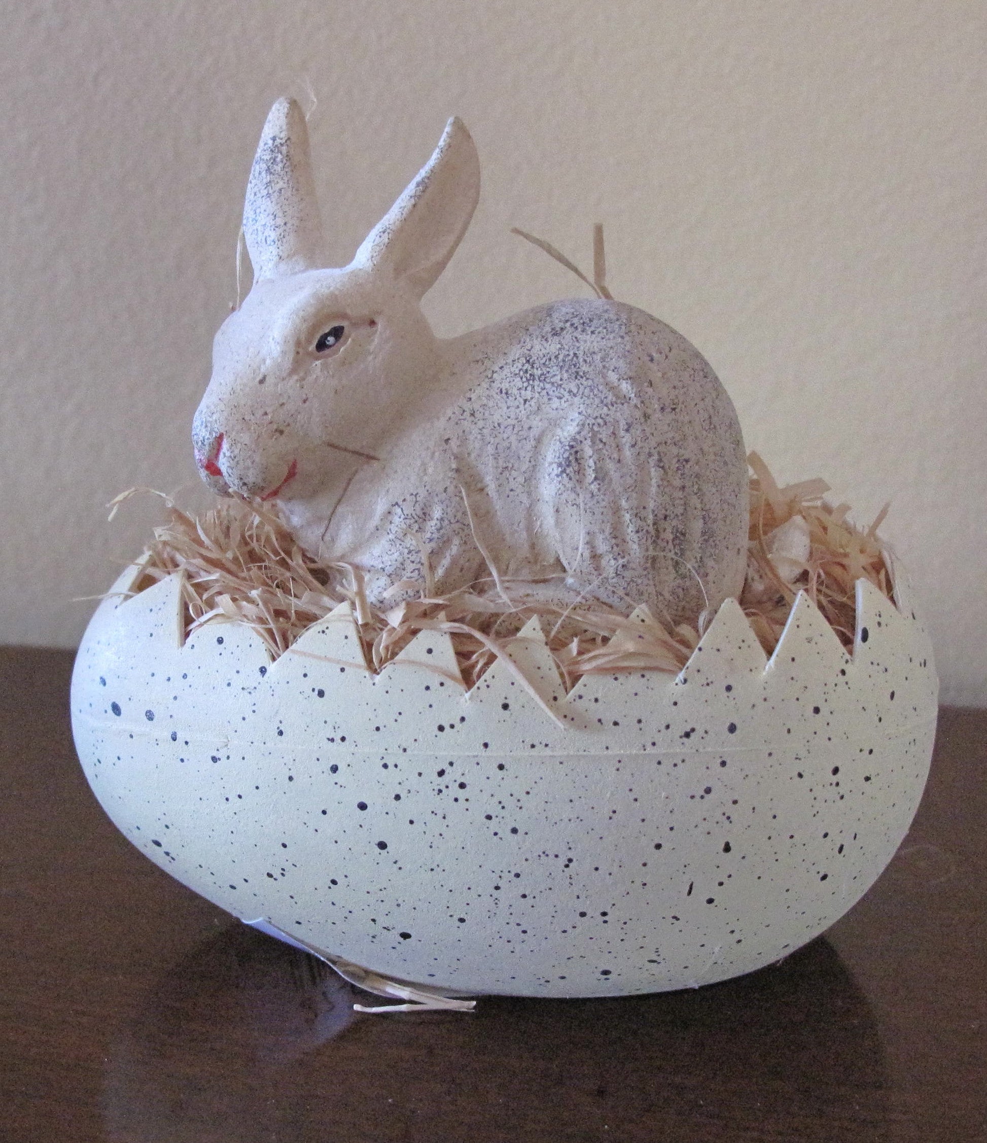 This cute bunny with his pink nose and bright eyes sits on some straw in an egg half-shell. Use for decoration or as placecards at your Easter dinner table. 3" x 3".