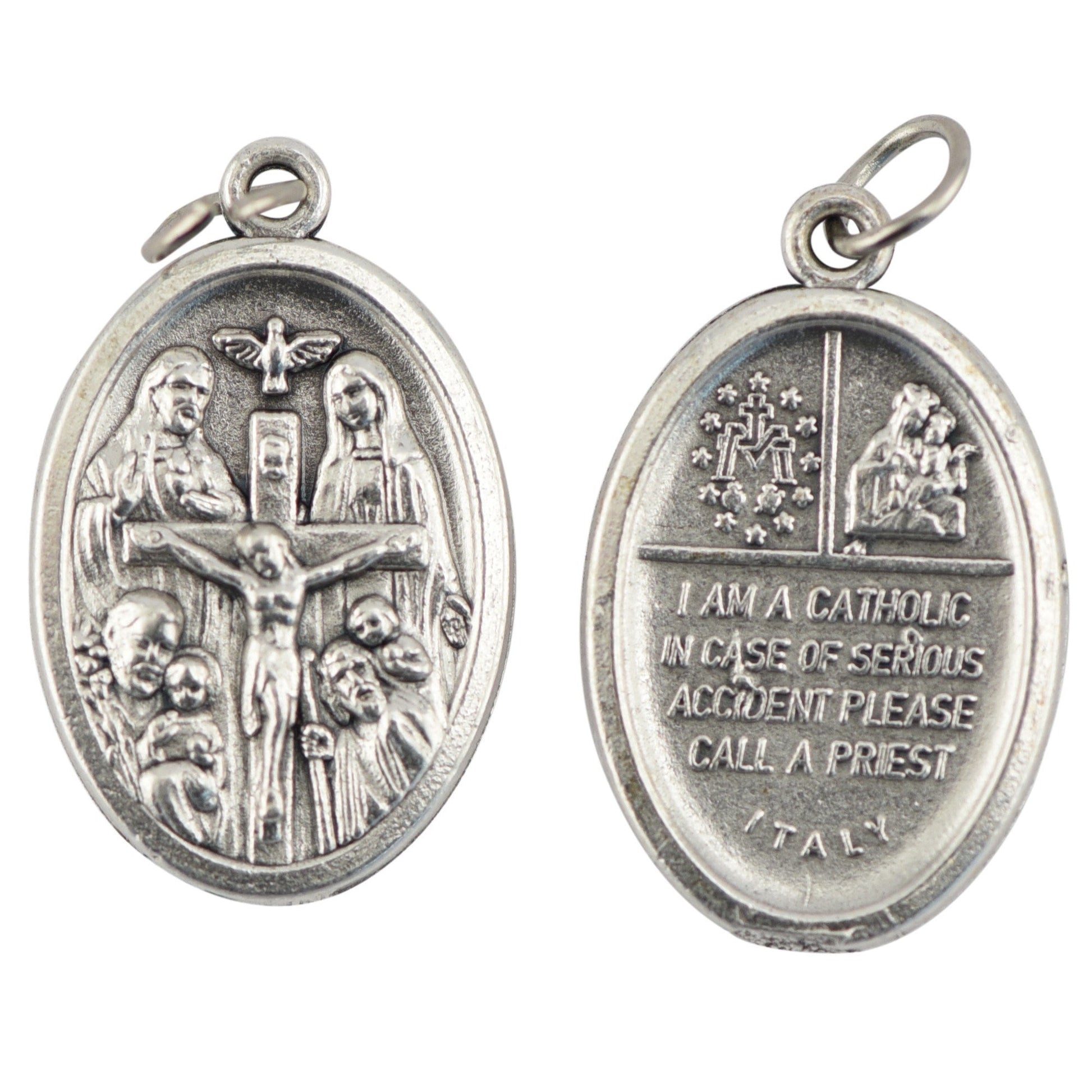This Medal has the images from the Four-Way Cross on one side, and the message "I am a Catholic. In case of serious accident please call a Priest" on the other. The medal is 2.2 cm, and made of oxidized metal. Made in Italy. Does not come on a chain.