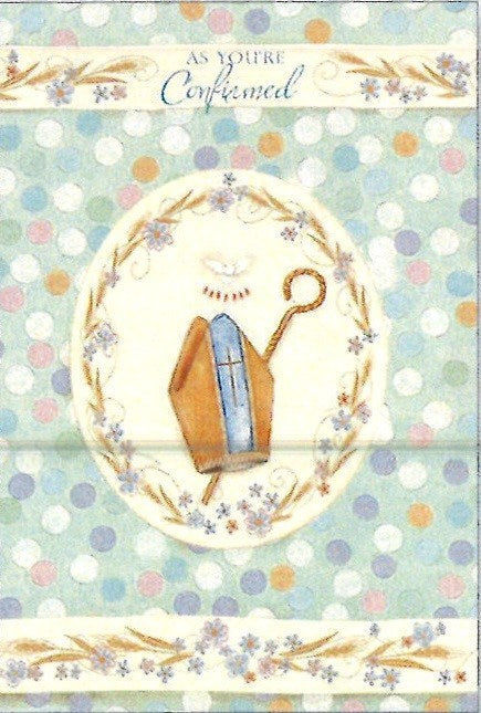 This lovely greeting card is embossed, and has an image of the Bishop's Crozier and Mitre with the Dove of the Holy Spirit above. This would be suitable for a boy or girl, as they are Confirmed. Verse on front: As you're Confirmed.. Verse inside: May the light of God surround you on your Confirmation Day. May He love you, protect you and watch over you always. Congratulations! Bible verse inside: “I am the light of the world. Whoever follows me will not walk in darkness, but will have the light of life.” - John 8:12.