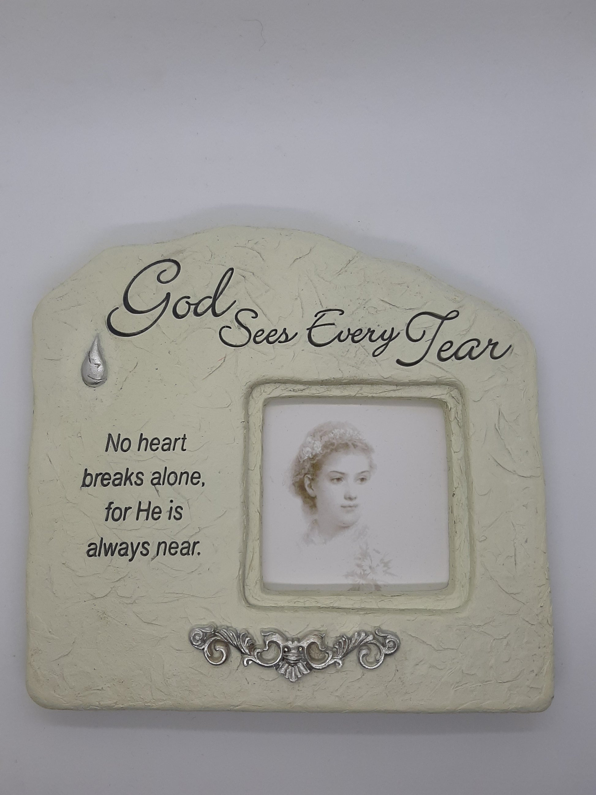 This memorial frame would be a lovely addition to your home décor. This would also be a nice gift for a friend or family member who has recently lost a loved one. Comes with a prayer card, and a small gift card which is blank inside and ready for your message of condolence to the recipient of this thoughtful gift. Holds a 2 1/2" tall picture, frame measures 5 1/2" tall and 6" wide. Made of resin, gift boxed.