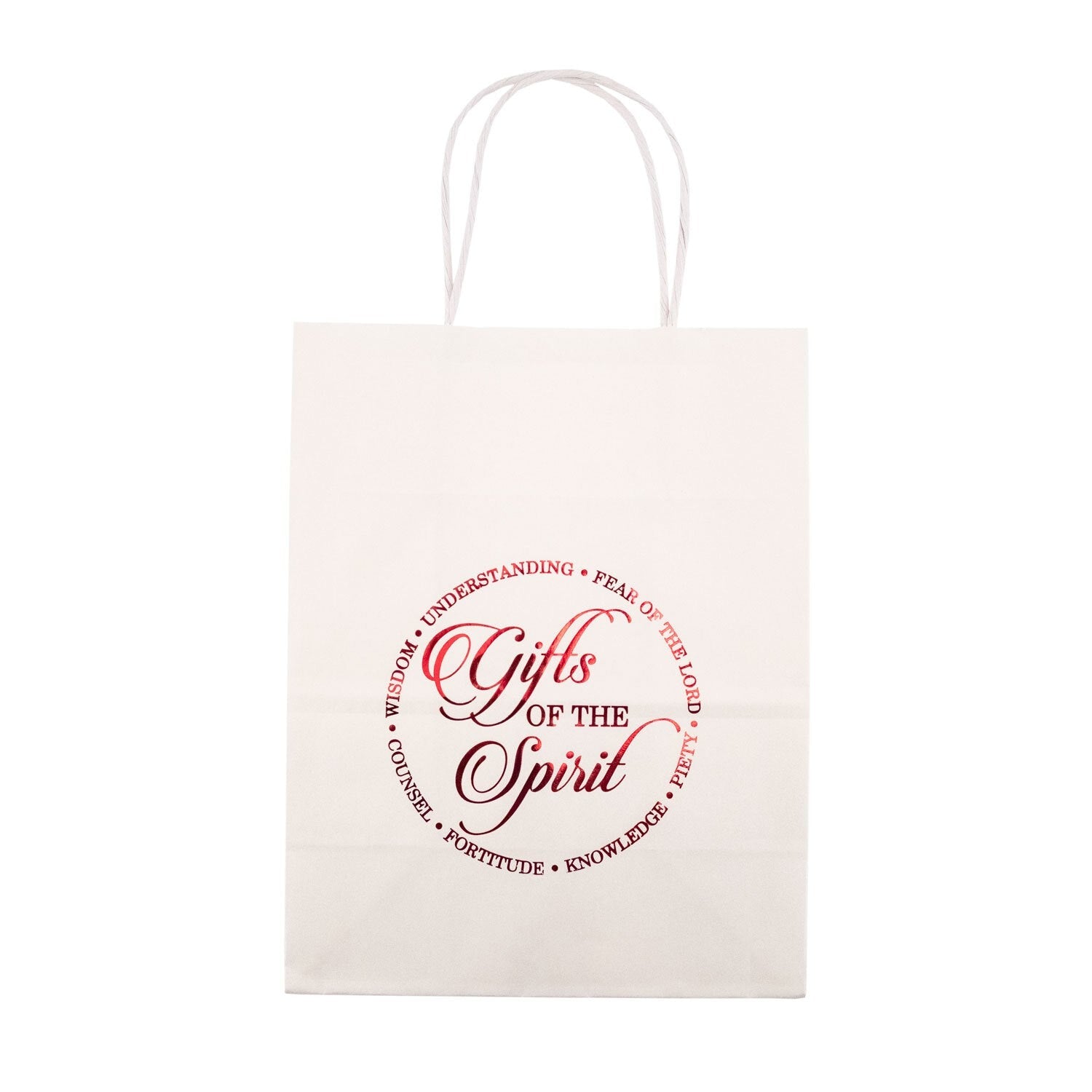 This 13" x 10" white deluxe gift bag with metallic red stamp "Gifts of the Spirit", is suitable for boys or girls. Made in Canada.